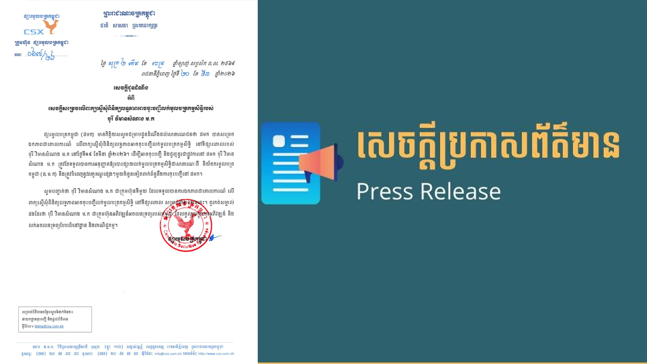 រុមហ៊ុនផ្សារមូលបត្រកម្ពុជា នៅថ្ងៃទី២០ ខែមីនា ឆ្នាំ២០២៦នេះ បានចេញសេចក្តីប្រកាសព័ត៌មាន បញ្ជាក់ពីការសម្រេច ឯកភាពជាគោលការណ៍ លើពាក្យស្នើសុំពិនិត្យលទ្ធភាពអាចចុះបញ្ជីលក់មូលបត្រកម្មសិទ្ធិ (ភាគហ៊ុន) នៅទីផ្សារគោលរបស់បុរី វិមានសំណាង ម.ក។